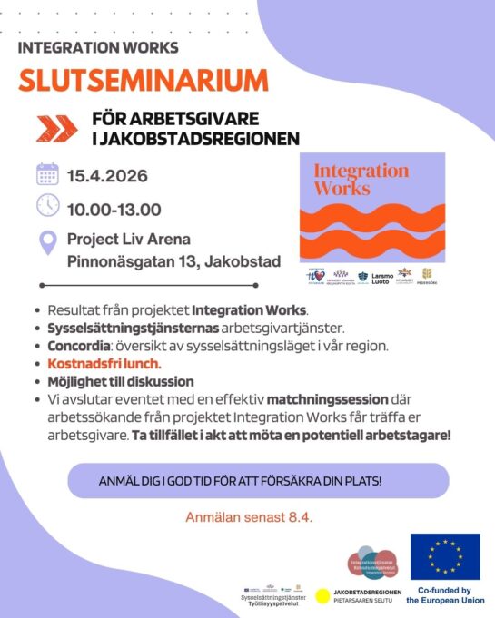 Hur ser sysselsättningsläget ut i vår region och hur kan ni som arbetsgivare få stöd? På Integration Works slutseminarium delar vi projektets viktigaste resultat, och ni får höra hur Sysselsättningstjänsterna kan stöda er. Concordia ger också en aktuell översikt av sysselsättningsläget i regionen.